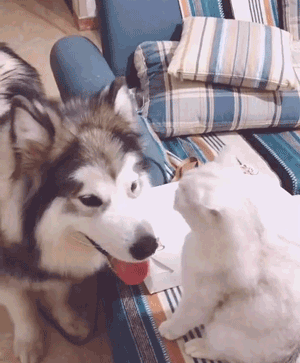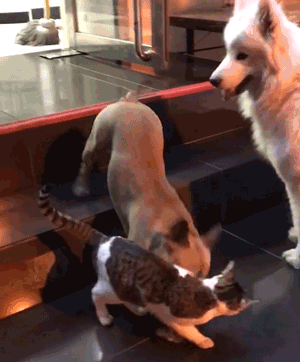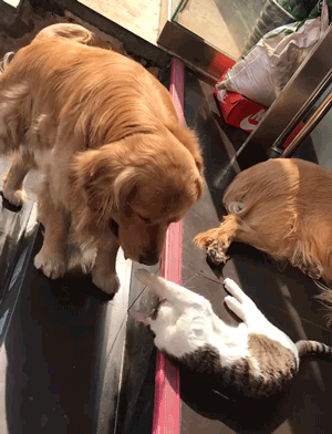 后来我发现,这只猫咪能得到大金毛如此的青睐,其实是有原因的,那就是对待感情非常专一,任凭其他狗狗怎么撩,都无动于衷!
