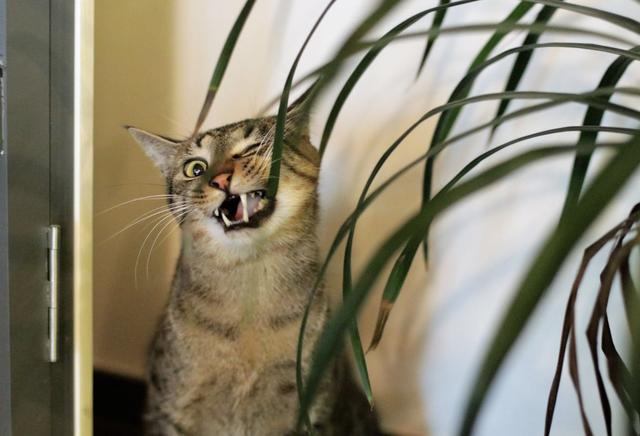 这是胖喵屋另一位客人,是一种中国狸花猫,当时正在啃食胖喵屋里一颗盆栽,被Tina抓拍下逗趣的瞬间!