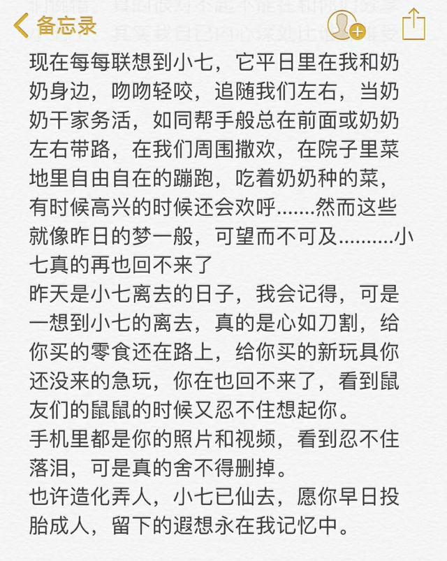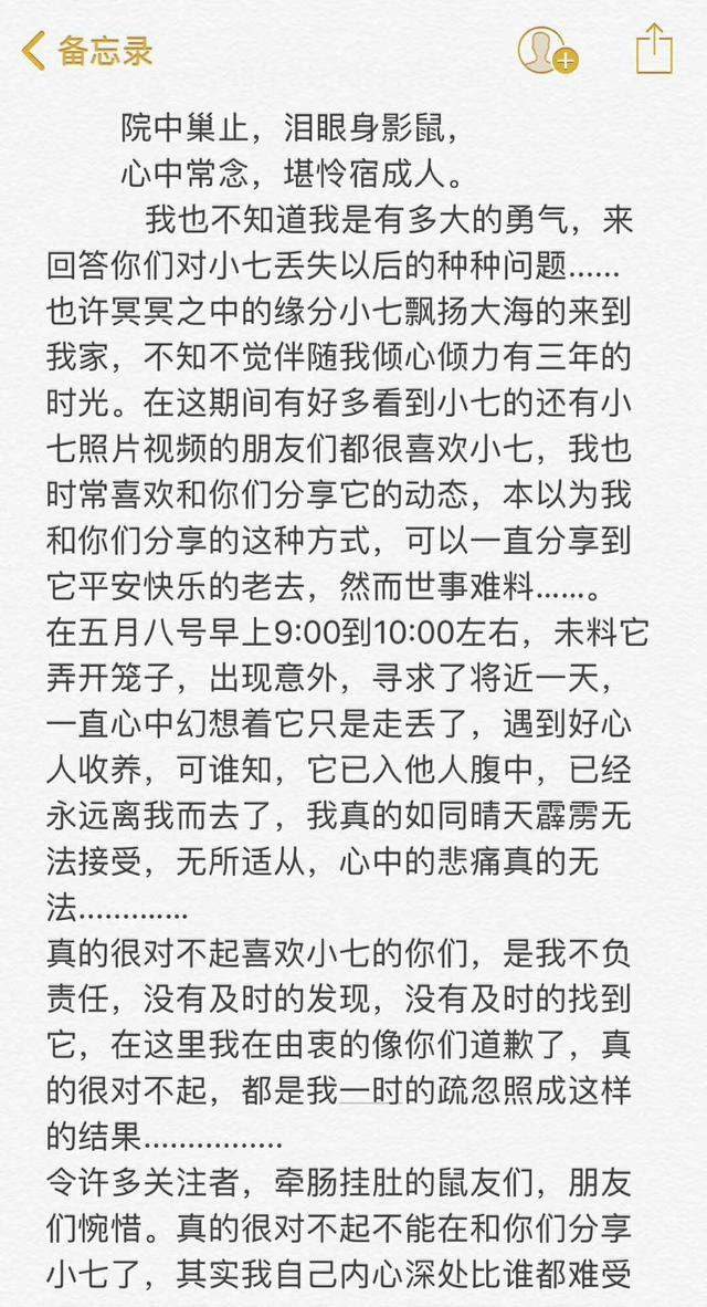 不管小七落下个什么样的下场,小七终究是回不来了,主人没有别的意思,她也不想再和老人周旋,只想给爱小七的朋友们一个交代,你们的小七走了!特此拜托华元君和大家说一声,感谢你们一直以来对小七的喜爱,很抱歉没能照顾好小七!