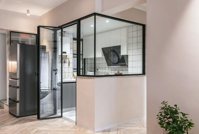 为了保证良好的空间通透性,厨房内部将冰箱移至室外,并在隔断上采用半玻璃设计,改善整体封闭的空间格局。