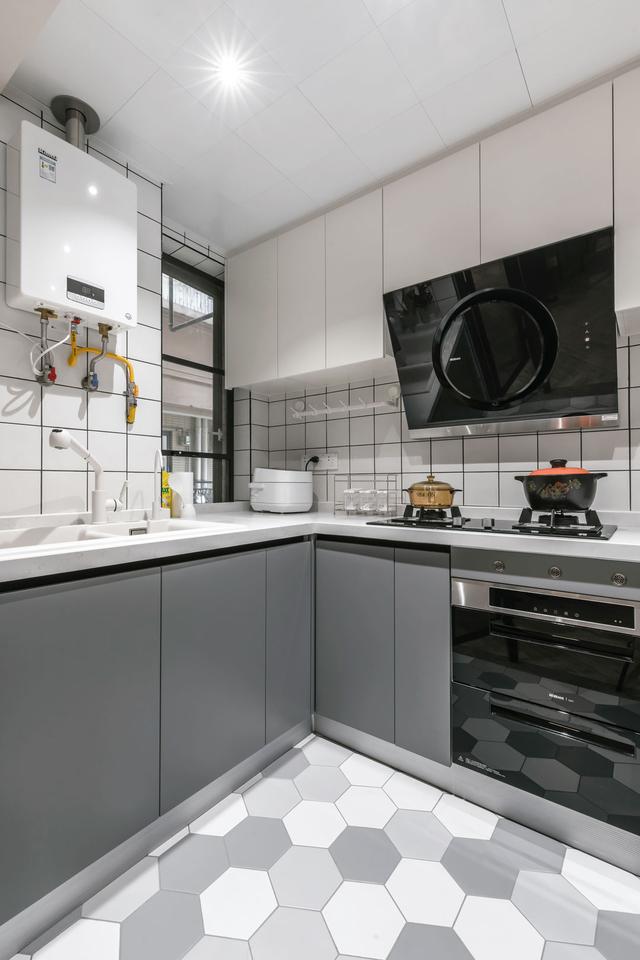 厨房的地板采用六边形瓷砖,与空间外的鱼骨纹地板相区别,增加了空间乐趣。
