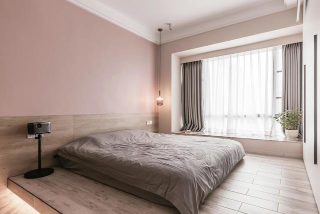 主卧不买床。它采用定制设计。整体性更好。床头淡淡的粉色,搭配灰色的床品,协调温馨,温馨舒适。