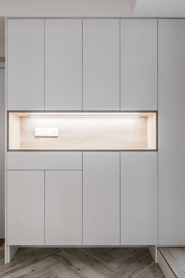 设计玄关后,为了保持空间的整洁,加强了空间的收纳功能。鞋柜采用中上式设计,灯带嵌入中间,打造桌子,提高日常使用的舒适度。