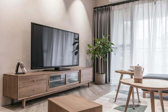 我没有选择电视墙,而是选择用米色乳胶漆打底。搭配一个原木电视柜。它既不太单调也不太花哨。