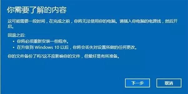 6、仔细阅读注意事项,全过程需要有稳定电源支持,也就是说笔记本和平板电脑需要在接入电源线的状态下进行回退操作,电池模式不被允许;系统还提示了一些关于文件和程序可能受到的影响。了解并采取措施之后,点击“下一步”继续;