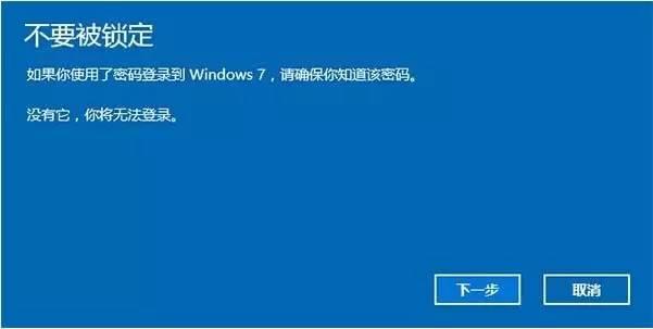 7、 对于已经设定登录密码的用户,回退后密码将被恢复,因此你需要知道该密码才能正常登录。确认该消息不会影响到你的使用后,点击“下一步”继续;