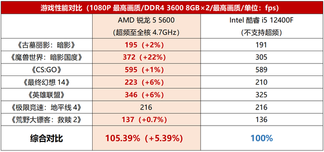 接着是实际游戏性能的对比,由于酷睿i5 12400F不支持超频,所以全核4.0GHz就是它的真是实力了。这次遇到32MB大三级缓存、4.7GHz全核频率的锐龙5 5600,自然讨不到什么便宜。从游戏性能实测来看,全核超频到4.7GHz的锐龙5 5600优势明显。从表中可以看到,在超频BUFF的加持下,锐龙5 5600的《魔兽世界:暗影国度》的帧率甚至高出酷睿i5 12400F 22%之多,综合7款游戏来看优势达到了5.39%。