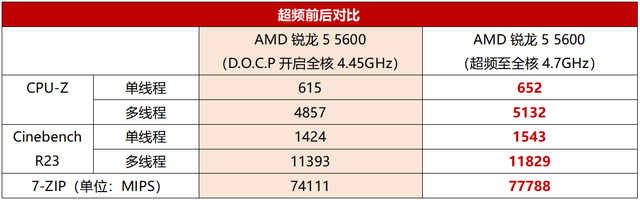 前面提到锐龙5 5600具有非常不错的超频潜力,将其全核提升至4.7GHz也仅仅是平均水平。从测试可以看到,在4.7GHz全核频率下,锐龙5 5600的性能提升非常明显,特别是单核性能,这对于游戏帧率的提升很有帮助。