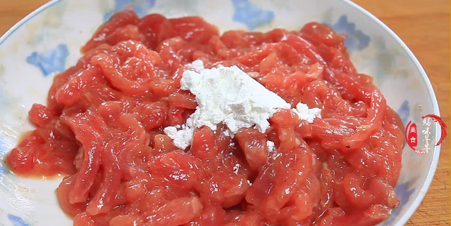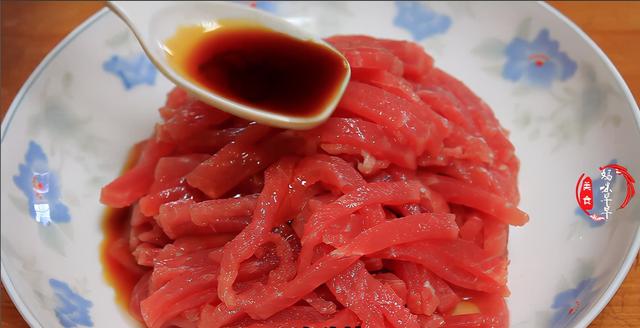 3,肉丝里面加一勺料酒,两勺生抽,一勺食用油,一点盐,一点儿五香粉,然后将调料和肉丝馅给它抓拌均匀,然后加入一勺淀粉继续抓均匀腌制上10分钟。