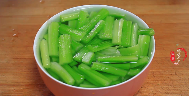 1,芹菜去掉叶子洗净后,把筋撕掉,这样吃的时候就很容易嚼得动,接着把芹菜从中间划开,如果是小芹菜的话就省略这一步了。最后把芹菜切成小段放入清水里面,加一勺盐,浸泡一会儿。