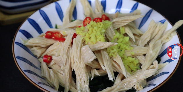 4、过凉的腐竹倒入碗中,然后倒入裙带菜,放入切好的姜末和小米辣,加上一勺的蔬芝麻,然后淋上热油激发出香味。