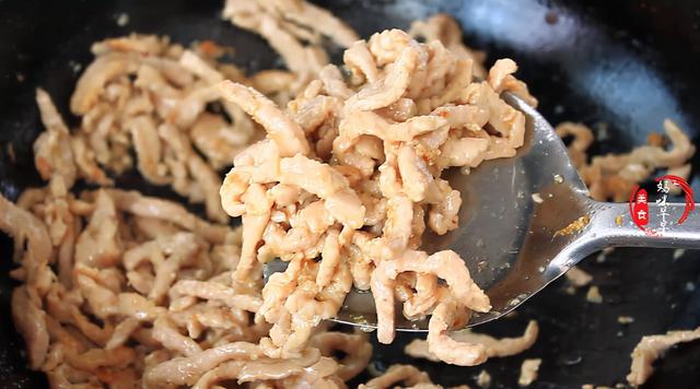 4,准备一根红椒清洗干净切成细丝备用,锅热后倒入油,把油烧热,倒入腌好的肉丝翻炒,肉丝炒至颜色变白,盛出备用。