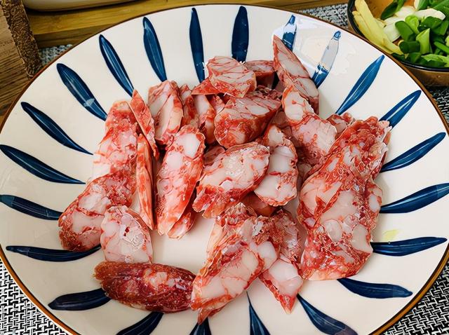 3、准备火腿斜刀切片,我用的是广味香肠,如果喜欢五香味或者麻辣味的香肠都可以,根据自己喜好,也可以换成五花肉之类,总之怎么开心怎么来。