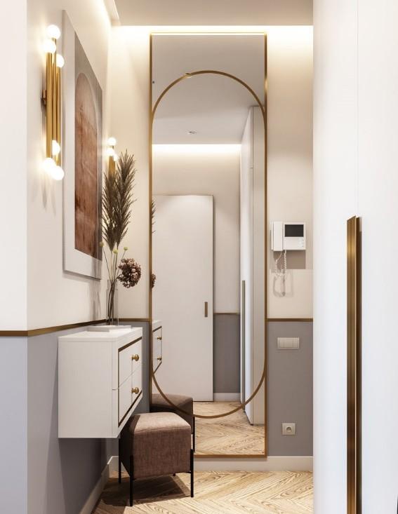 整个玄关是现代简约的设计,精致的流线型,大气。白色为底色,金色镶边的设计看起来非常精致。