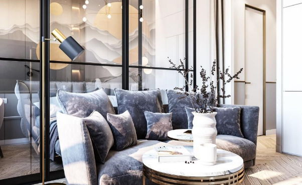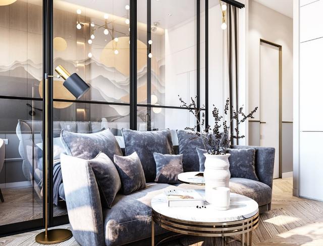 为了增加整个空间的通透性和视觉感,客厅和卧室区域中间有一个玻璃隔断。
