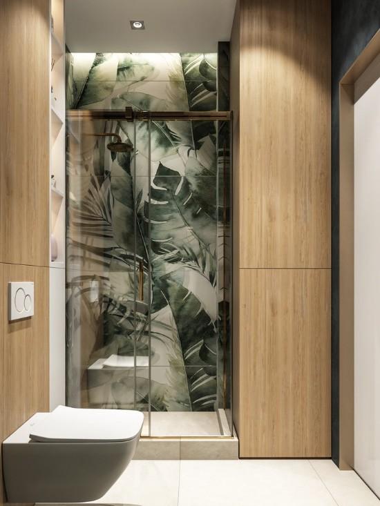 卫生间是干湿分离的设计。淋浴区绿色渐变树叶的设计有一种中国泼墨画的感觉。意境和设计感十足。这种装修风格也体现了阿姨内心的大气和沉稳。
