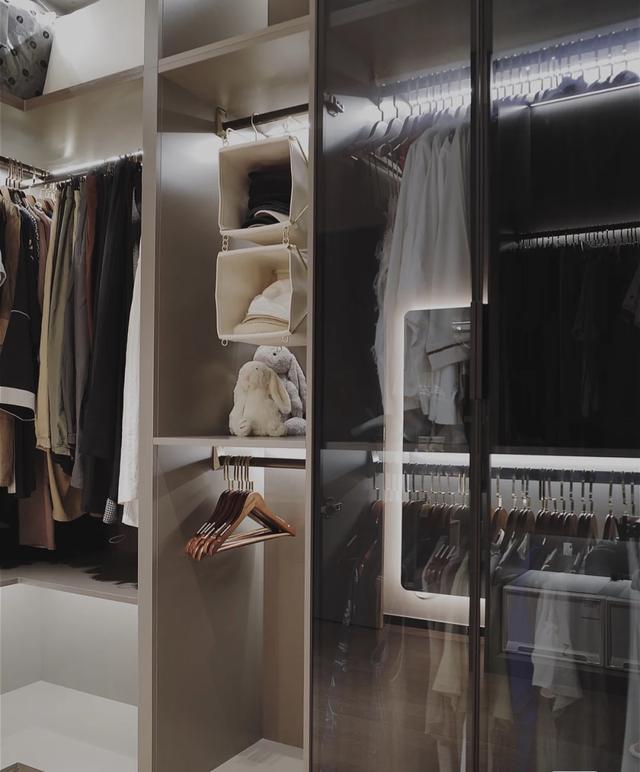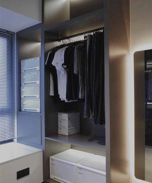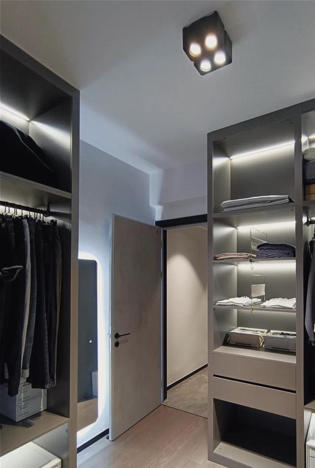 没有衣柜的门,设计了风扇玻璃柜门。整个柜子一目了然。同时在柜子里安装了灯带,方便寻找衣服。