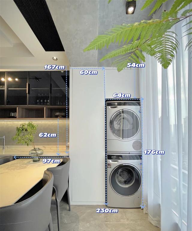 北阳台被设计成洗衣区,天空之巅被定制。橱柜的尺寸是预定的。原来的建筑雨水管也藏在柜子里。保护用品的储备。