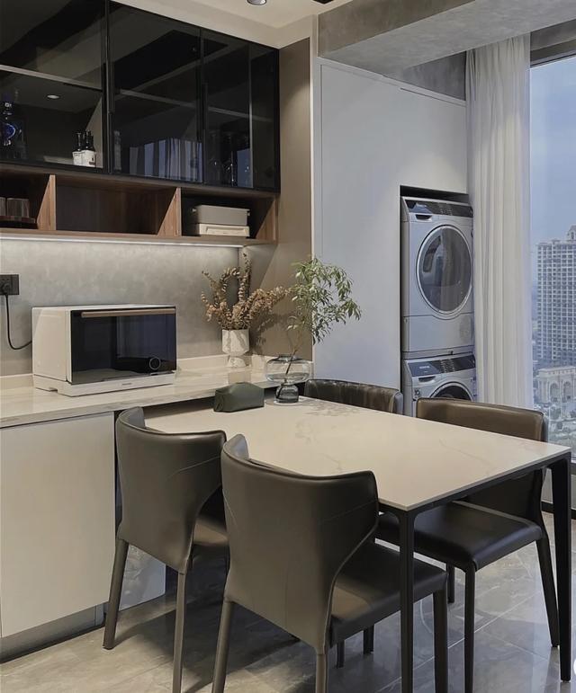 餐厅包含在北阳台的部分空间内。原来的餐厅区设计了一个多功能吧台,它既是一个橱柜,也是一个储物柜水吧表电气柜。在这里我们制作一些饮料和甜点,享受悠闲的下午茶时光,满满的幸福。