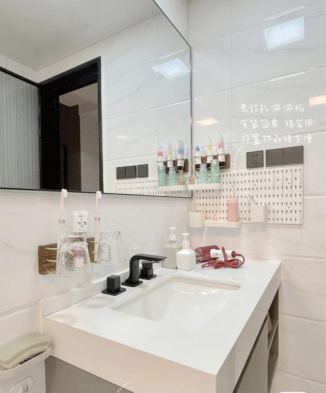 浴室柜右墙上设置了一个镂空板,主要用来放置日常用品。拿到手也方便。