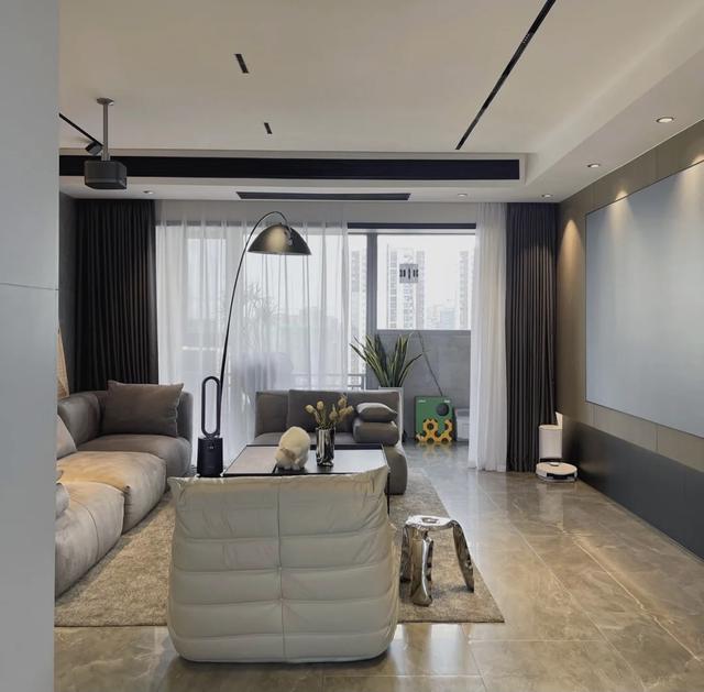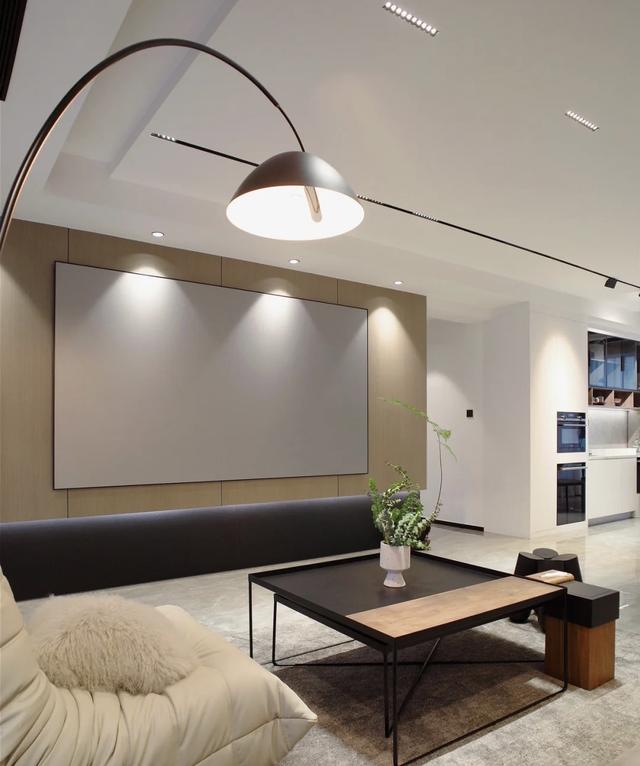 因为地面是瓷砖,所以电视背景墙不再使用大理石。选择了木质表面。整个空间更加柔和。