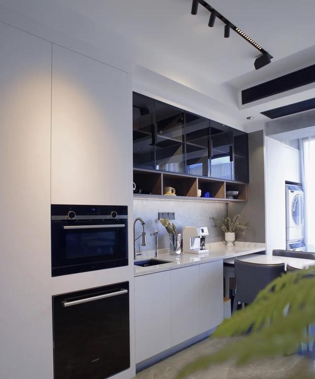 l型厨房,整体动线很流畅,台面是石英石,不容易渗透酱料。黑色石英石单槽池,刷锅很方便。感觉棒极了。