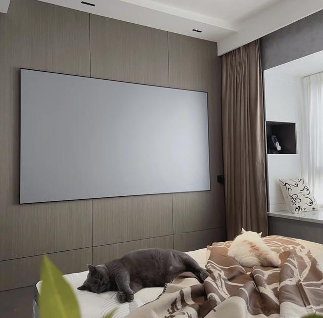 主卧还设计了影视墙。100寸黑钻防光软屏木饰背景墙。投影仪隐藏了电源和驱动器。吊顶时预留电线,将它在空调内驱动回出风口,方便维修。