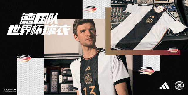 作为“四星冠军”的德国队,球衣采用了队徽中置的新颖设计,金色的阿迪达斯标志和德国队徽依次放置在黑色区域的中央,两侧则是传统的白色。圆领上有着德国国旗的三种颜色。