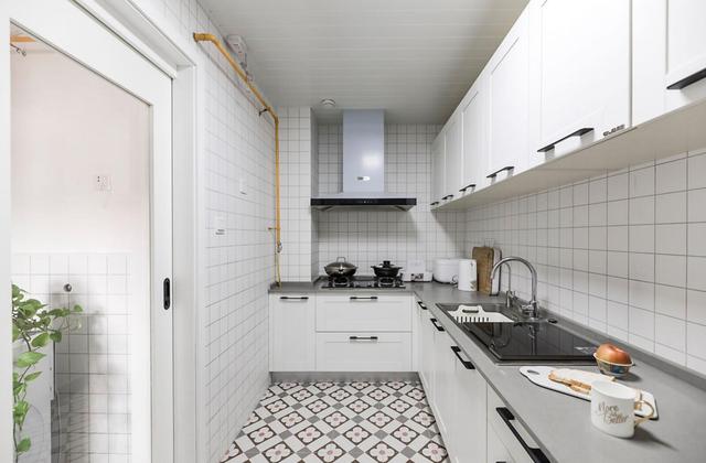 给厨房贴上白色小瓷砖,干净的同时也间接提高了空间的亮度。在橱柜水槽的配置上,有一点要说的是放弃常规的子母双槽盆,选择大单槽盆,用起来会特别方便,谁用谁知道。左边的生活阳台被用作洗衣区。