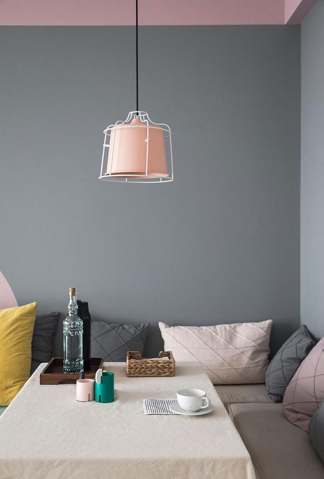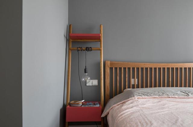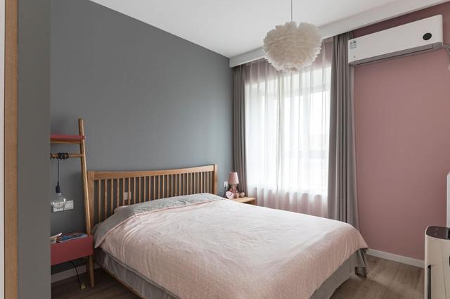 主卧墙面的大面积灰色,以及大面积轻粉的运用,让空间在宁静中浪漫又不失少女心。木床的使用带来了一丝温暖。不过顶部的羽毛吊灯还是建议仔细参考一下。对于不勤奋的人来说,很容易发生。