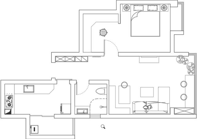 阳台与客厅相连后,作为功能区使用。绿植和猫舍的配置,既刷新了空间,又解决了猫咪睡觉的需求。中间极简的吧台提供了一点休闲空间,它不会遮住客厅的光线。右边的转角书桌也实现了办公和学习的需求。