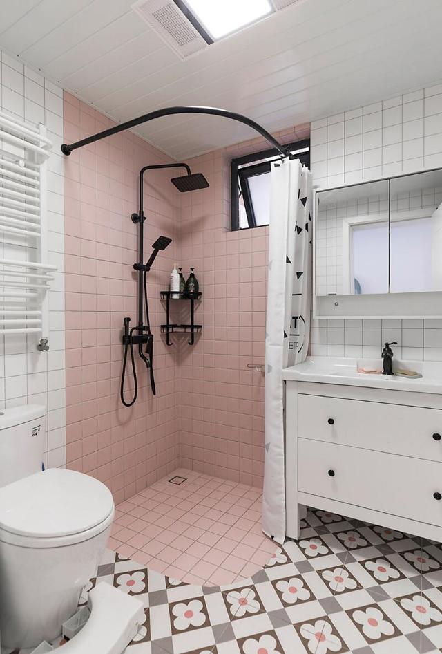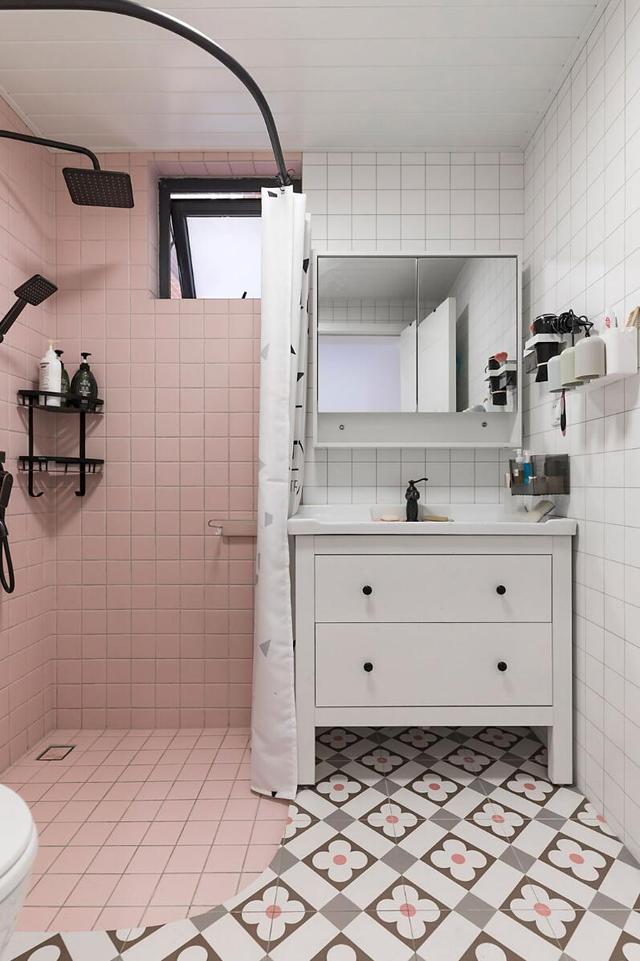 浴室不大。放弃淋浴玻璃隔断,用浴帘挡水,保留一定的空间感。墙砖大面积以小白砖为主,提供了简单的画面感;淋浴区的粉色小瓷砖带来一丝浪漫。