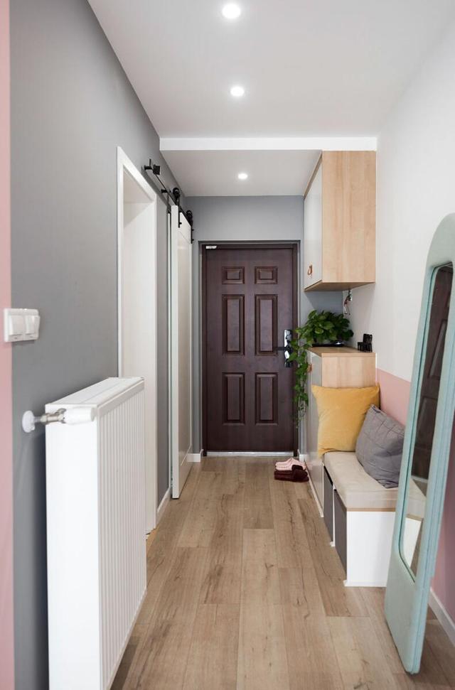 灰白色和低饱和度粉红色的使用奠定了整个房子的清新色调。实木地板的选择保证了空间的温馨感。玄关柜的设计兼具实用性和美观性。鞋柜部分采用上下分体设计。在满足日常收纳的前提下,中间镂空的部分再加一盆绿植,为家中也增添了一丝生气。