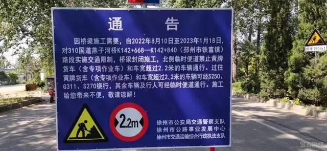 因2022年徐州市普通国省道桥梁维修改造工程施工的需要,为保障道路交通安全和施工顺利进行,依据《中华人民共和国道路交通安全法》和《中华人民共和国公路法》等有关规定,徐州市公路事业发展中心、徐州市交通运输综合行政执法支队和徐州市公安局交通警察支队决定:自2022年8月10日至2023年1月18日,对310国道燕子河桥K142+668——K142+840(邳州市铁富镇)路段实施交通限制,桥梁封闭施工,北侧临时便道禁止黄牌货车(含专项作业车)和车宽超过2.2米的车辆通行。过往黄牌货车(含专项作业车)和车宽超过2.2米的车辆可经S250、G311、S270绕行,其余车辆及行人可经临时便道通行。施工给您带来不便,敬请谅解!