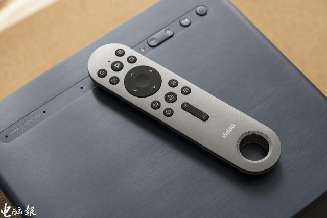 产品还附有一个遥控器,遥控器造型还蛮有意思,底部做了一个圆形的镂空,各种功能按键包括开关机、语音键、对焦键、设置等。另外,Vidda C1还支持远场语音,可以脱离遥控,直接用语音命令操作各项功能,加上简约的设计加上还算百搭的颜色,放在房间、办公室、露营地等都非常合适。