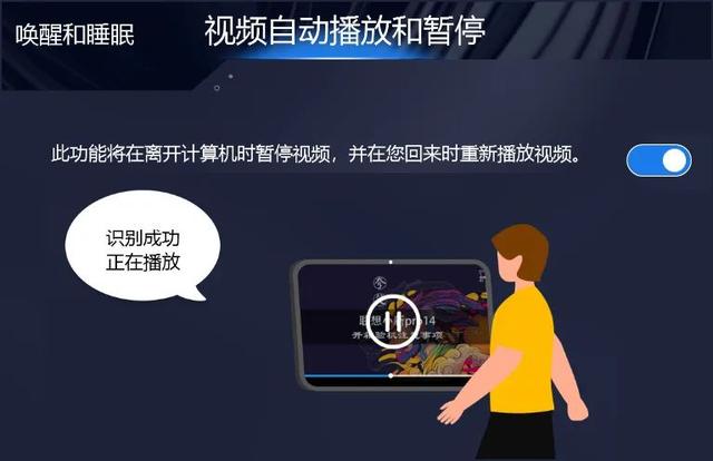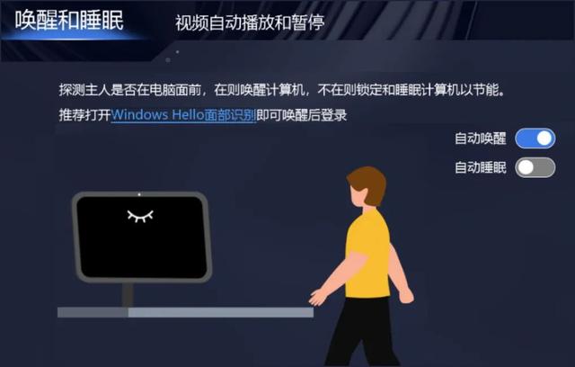 ●用户智能感知(如今改名叫“自动睡眠”和“自动唤醒”了)。这俩基于TOF近距离传感器和IR人脸识别摄像头的炫酷功能,由于戴尔Lati商用本和联想小新/YOGA Pro系列机型的使用,很多用户已知悉了。简单说就是:利用近距离传感器感应用户的存在和离开。当用户离开电脑旁,电脑自动息屏锁定(或睡眠);而当用户重新回到电脑旁,屏幕自动(从睡眠中恢复)点亮,然后通过IR摄像头识别人脸并登录系统(回到用户离开时的状态)。