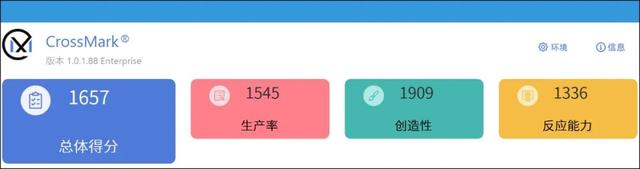 ▲CrossMark是考验CPU应对各种日常应用的综合测试,包含了生产率(生产力)、创造性(视频、图像等)和整机反应表现。得分依然超过了同处理器的ThinkBook 14+。