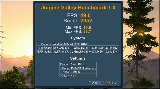 ▲这里要再度提到双通道LPDDR5 6000内存(最高运行在5200MHz上)。大家知道,集显靠内存做显存,因此内存越快,显存表现通常也就越好。所以,YOGA Pro 14s的i5-12500H处理器的80EU Iris Xe跑出了我们见过的最好成绩:Unigine Valley 49fps! 而绝大部分同类集显的帧数在43.5fps~45fps。
