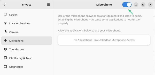 打开设置窗口(在 Ubuntu 或其他发行版的 GNOME 桌面中)。转到“隐私 > 麦克风”。并确保它已启用。