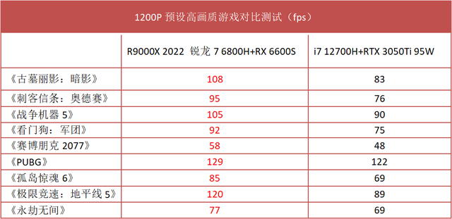 汇总来看,游戏对比实战测试对应了前面的基准性能测试结果:锐龙7 6800H+RX 6600S基本碾压了i7 12700H+RTX 3050Ti,两者的游戏性能可以说不在一个量级上。同时R9000X 2022在多款游戏测试中帧速达到了80fps以上,这意味着该机其实可以应对部分3A大作2.5K分辨率高画质游戏体验。