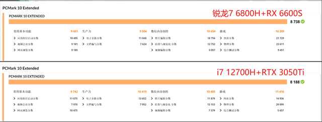 测试结果表明:锐龙7 6800H+RX 6600S对比i7 12700H+RTX 3050Ti,在日常轻度负载下,不管是常用基本功能还是生产力测试、数位内容创作,它们的分数都很接近,大体是一个级别的性能表现。原因很简单,对于大家的日常应用,8核16线程的锐龙7 6800H已经完全性能溢出了,所以尽管i7 12700H还具有小核心,线程数更多,但在日常应用中优势不明显。