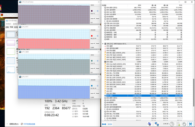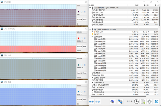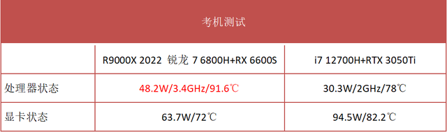 可以看出,在满载的情况下,170W的电源适配器对于锐龙7 6800H+RX 6600S组合的R9000X 2022来说够用了,甚至处理器还有超标性能释放。但是对于i7 12700H+RTX 3050Ti而言则不太够,导致i7 12700H功耗只有30W左右,频率仅2GHz,与之对比的是锐龙7 6800H功耗达到了48.2W,频率高达3.4GHz。体现在实际应用中:满载的情况下,R9000X 2022依然能保持双核心高功耗的性能输出,但对于i7 12700H+RTX 3050Ti,处理器的性能输出就要打折扣了。而与此同时,64W左右的RX 6600S性能表现依然强于95W的RTX 3050Ti。