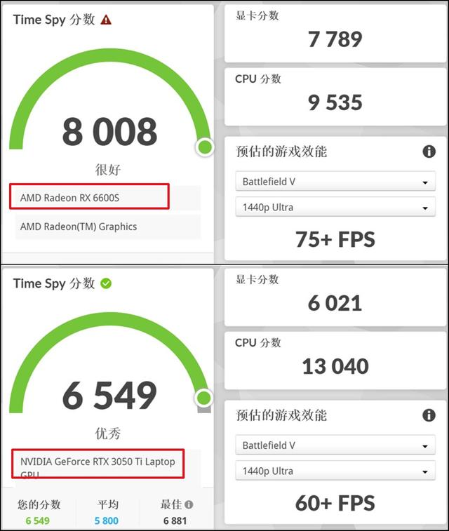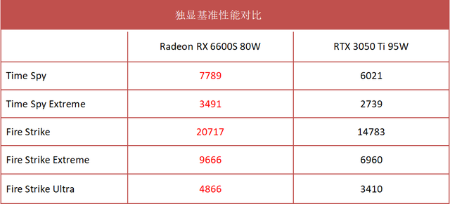 拯救者R9000X 2022搭载的RX 6600S最高功耗80W,从基准测试结果来看,所有项目都大幅度领先满功耗的RTX 3050Ti,例如在Time Spy 场景中,RX 6600S的成绩是7789,RTX 3050Ti的成绩是6021,RX 6600S要强29%。而在Fire Strike Extreme中,RX 6600S相比RTX 3050Ti领先幅度更是达到了38%。
