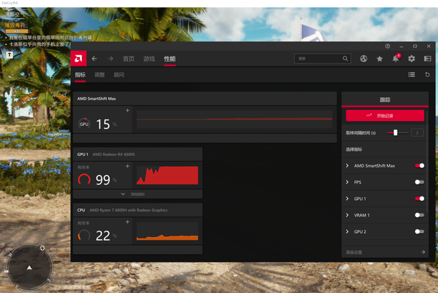 最开始我们提到,R9000X 2022是一款3A平台配置的电竞本,因此它当然也支持AMD SmartShift Max技术,可以灵活分配处理器与显卡的功率输出,实现最高的能效比输出。我们在运行《孤岛惊魂6》的时候打开AMD Radeon Software观察,可以看到,在运行《孤岛惊魂6》这类偏重显卡性能的3A游戏时,AMD SmartShift Max的功率分配更倾向于显卡,整体功率分配偏向显卡15%,从而提供更高的游戏帧率和能效比。