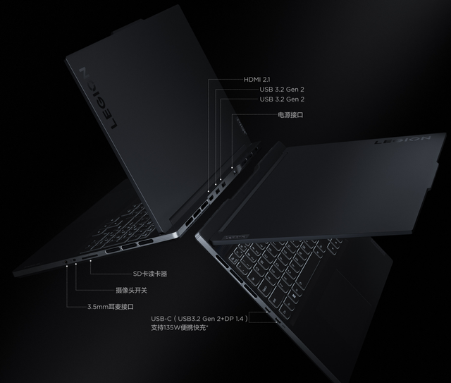 它的接口数量多,左侧是两个USB-C全功能口,最高支持100W PD充电(同时最高支持135W私有协议充电,例如搭配拯救者C135适配器);右侧是3.5mm音频口和SD读卡器,尾部有两个USB的大口,一个HDMI2.1接口。