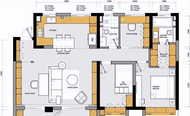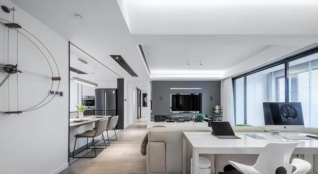 。三房两卫一厅一室的布局,还拥有一个开放式的工作区,全屋看起来轻奢又高级!