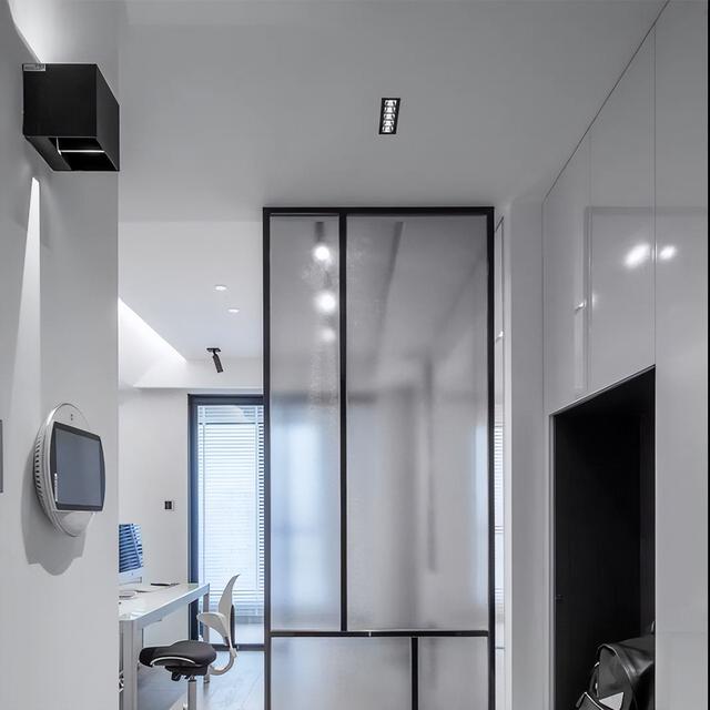 。这里用磨砂玻璃做隔断,黑框玻璃框在保持通透性的同时分割空间,非常时尚美观!
