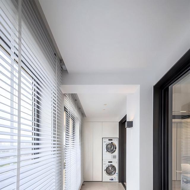 ,一侧的收纳柜内嵌有洗衣机和烘干机。除了洗衣功能,没有安排其他功能。阳台上设置了白色百叶窗,这里的效果比布艺沙发干净。