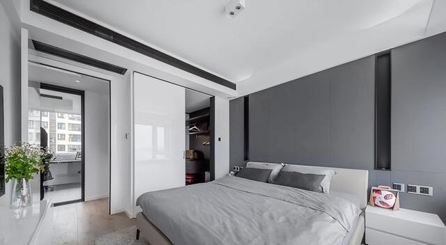 主卧采用深灰色和浅灰色的搭配增加层次感,全屋所有可见的空调口都采用黑色勾线设计,与整体搭配立体时尚!
