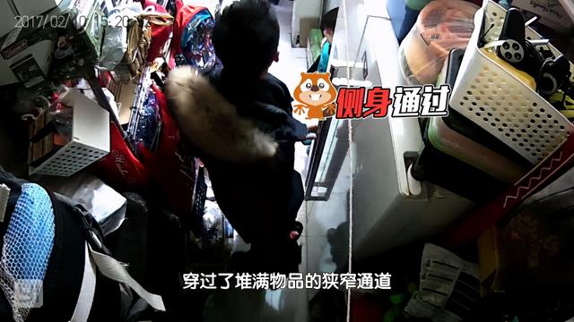 小高的家居过道里有储物柜、冰箱、杂物,一个过道里只剩下一个侧面空间,也只有侧身才可以通过。